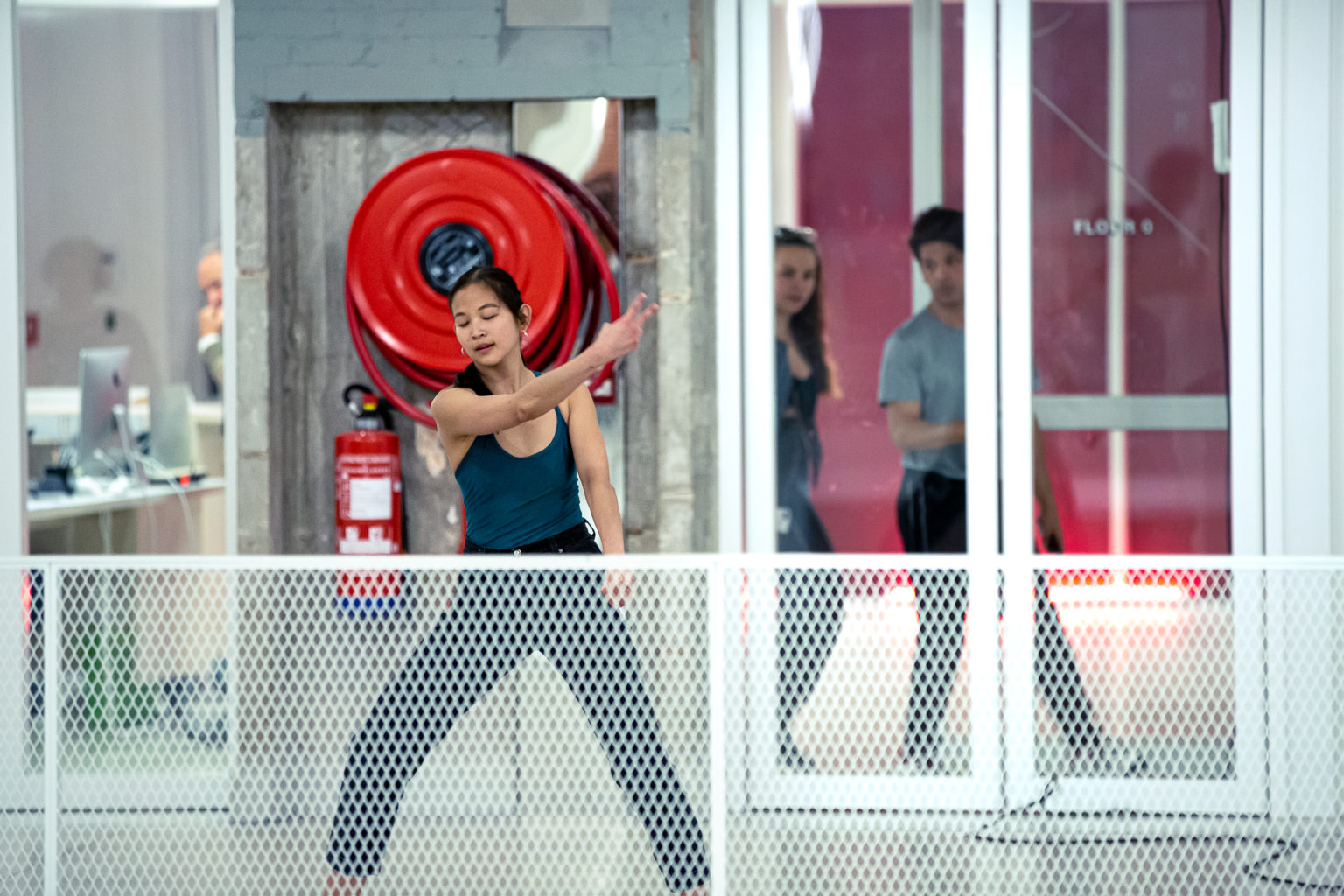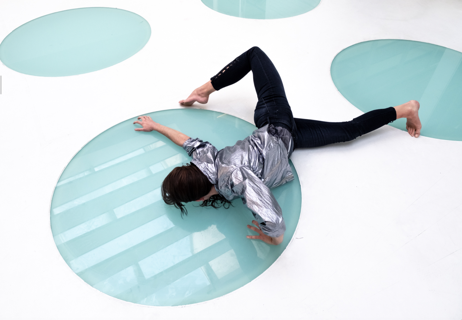 L’artiste plasticien Britannique Jonathan Sullam collaborateur habituel de la chorégraphe sculpte l’espace muséal d’une forêt de colonne d’eau.